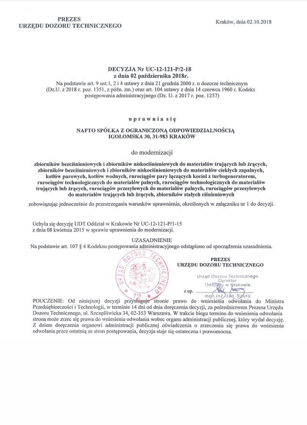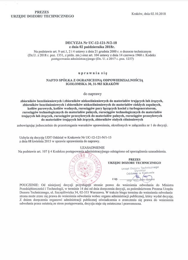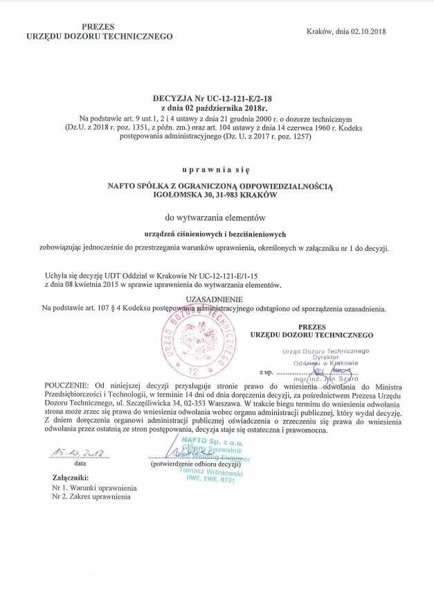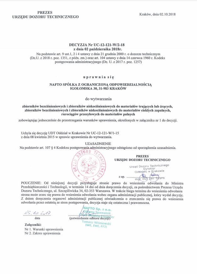In April 2015, NAFTO S.A. obtained authorisations issued by the Office of Technical Inspection to manufacture: