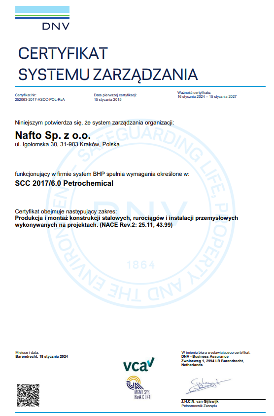 Od lipca 2019 NAFTO posiada Certyfikat Systemu Zarzadzania zgodnie z nową normą SCC 2017/6.0 Petrochemical.